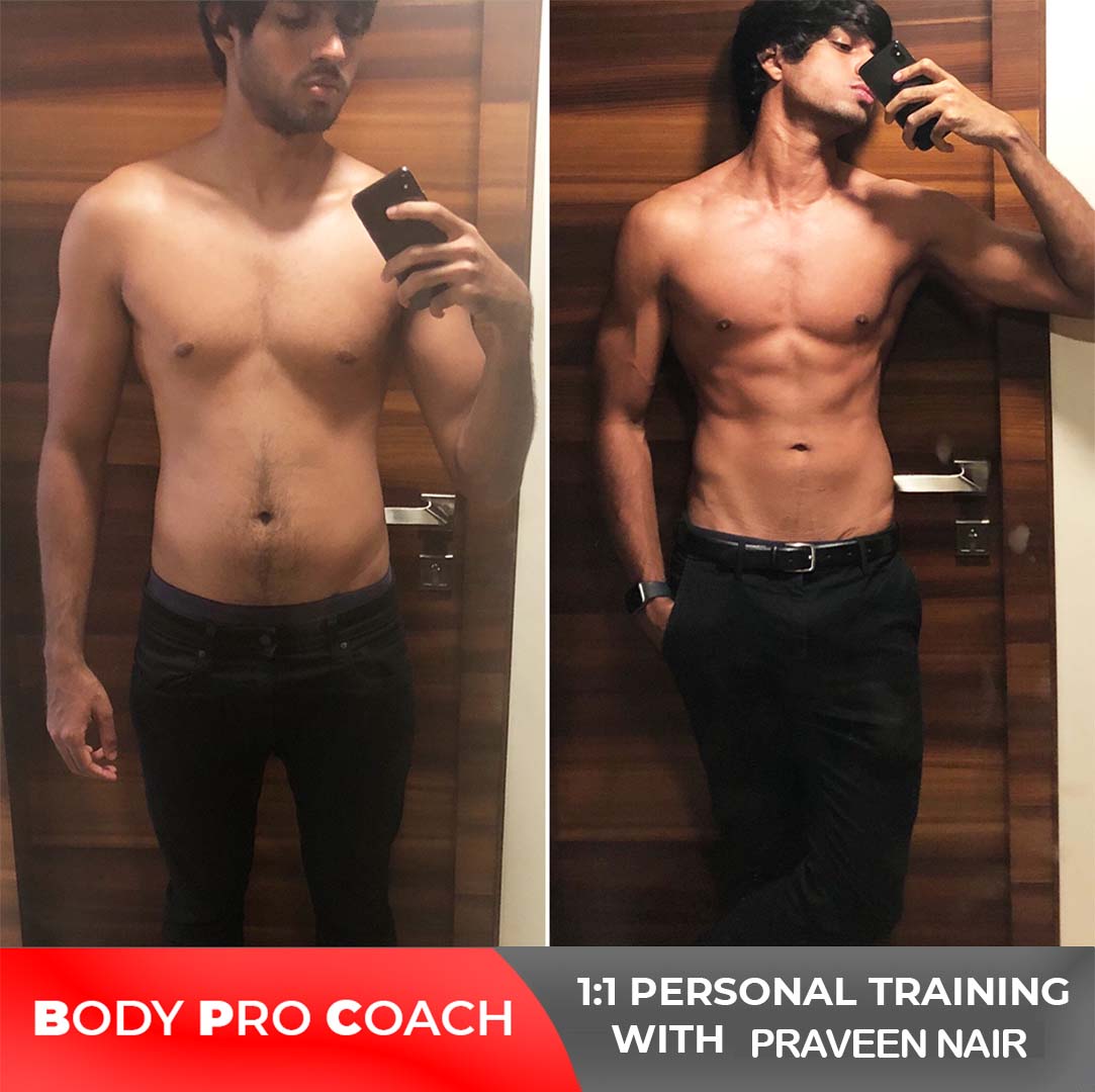 I really worked hard to achieve but that all wouldn’t have been possible without the Maahek’s motivation and constant push and I think it is so important when you have your trainer holding you having you back and telling you are doing incredible push harder that’s what is needed and Maahek Nair is known for that I can’t wait for my next program and let’s see where we get I am super pumped up thank you so much. I think this transformation has increased my confidence so much from where I was and I will never ever forget what Maahek has done for me and what I am looking to get into is solely because of Maahek's efforts Thank you so much Maahek Nair and BodyProCoach.